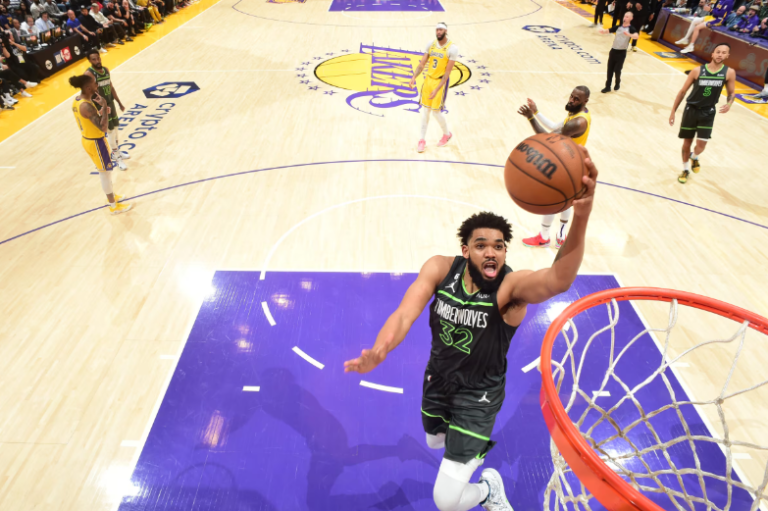 明尼苏达森林狼队的卡尔-安东尼-唐斯对阵洛杉矶湖人队。