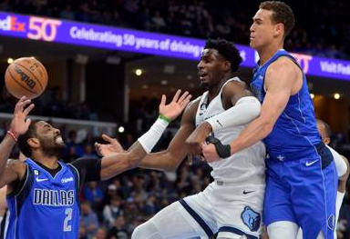 2023 年 3 月 20 日,孟菲斯灰熊队的小贾伦杰克逊(#13)在田纳西州孟菲斯联邦快递论坛的一场比赛中为达拉斯小牛队的凯里欧文辩护。