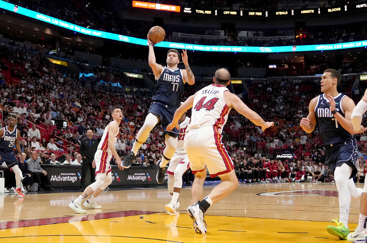 吉祥坊达拉斯小牛队的卢卡东契奇在对阵迈阿密热火队的比赛中打进一球。