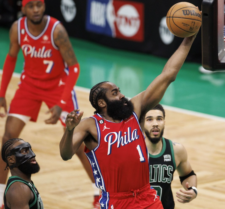 吉祥坊费城 76 人队的詹姆斯哈登在 NBA 东部半决赛第一场比赛中得分。