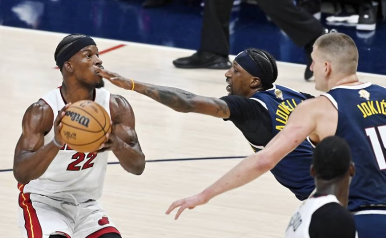吉祥坊在 NBA 总决赛第 4 场比赛中,丹佛掘金队的肯塔维厄斯·考德威尔-波普防守迈阿密热火队的吉米·巴特勒。