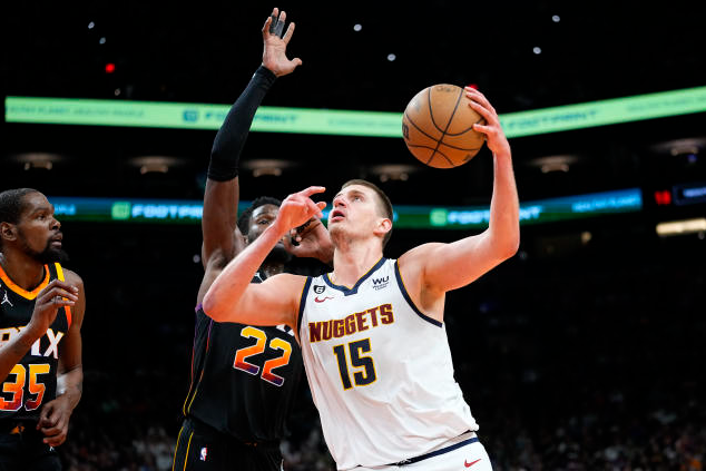 丹佛掘金队的尼古拉约基奇在 NBA 西部半决赛第 3 场比赛中得分。